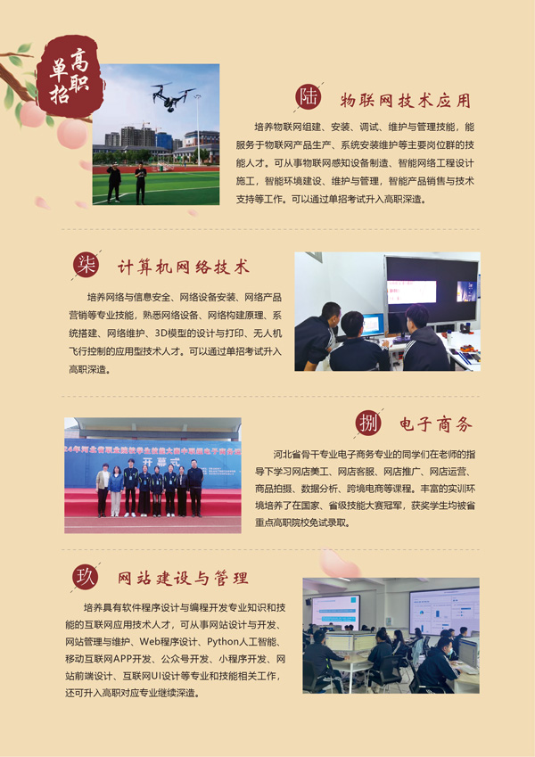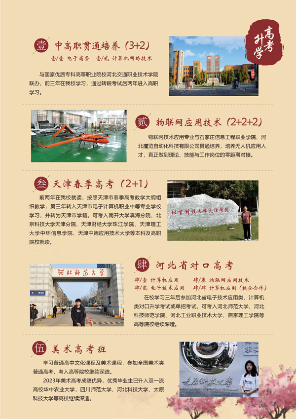 秉持秉持“办有温度的职业教育”的育人理念,学校持续深化“三教”改革,“岗课赛证”综合育人,不断提升教育教学质量。国家、省、市技能大赛,电子信息学子摘金夺银、载誉而归,自二零零七年起至今,我校三十余次代表河北省参加全国职业院校学生技能大赛,共获得奖牌三十余枚。特色评价、社团活动,激发学生向上向善正向能量;引企入校、现代学徒制,让学生与未来的岗位零距离。对口升学、美术高考,高职单招,为学生多元发展提供平台,一批批学生升入天津大学、天津中德应用技术大学、河北师范大学、河北科技师范学院,石家庄学院,河北工业职业技术大学等本专科院校继续深造,圆梦大学。