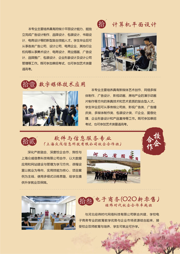 学校办学历史悠久,学校办学历史悠久,一九八四年率先在河北省开办电子计算机专业。四十年栉风沐雨、踔厉奋发,始终紧跟行业发展和社会需求,不断满足学生对信息技术学习的多样化需求,为当地经济发展培养一专多能、适应性强的技术技能型人才。